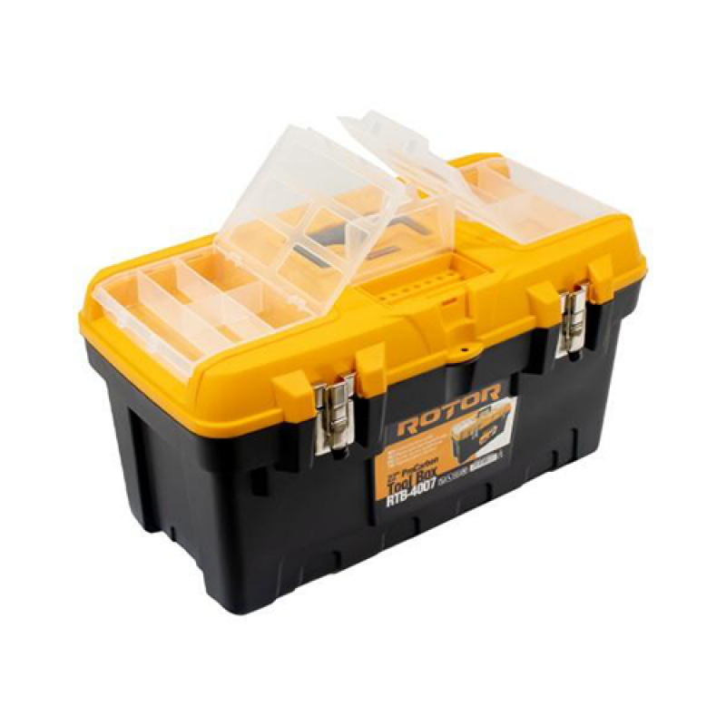 Ящик оснащён удобной ручкой для переноски и надёжными замками, обеспечивающими плотное закрытие крышки. Внутреннее пространство позволяет аккуратно разместить инструмент, а компактные размеры делают Rotor RTB-4007 удобным для работы дома, в гараже, на стройке или при выездных работах.