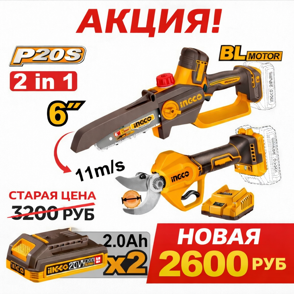 Универсальный комплект 2-в-1 для сада и дачи: мини цепная пила 6" для распила веток и садовый секатор для аккуратной обрезки кустов и деревьев. Работает в одной системе INGCO P20S, а в наборе уже идут 2 аккумулятора по 2Ah.